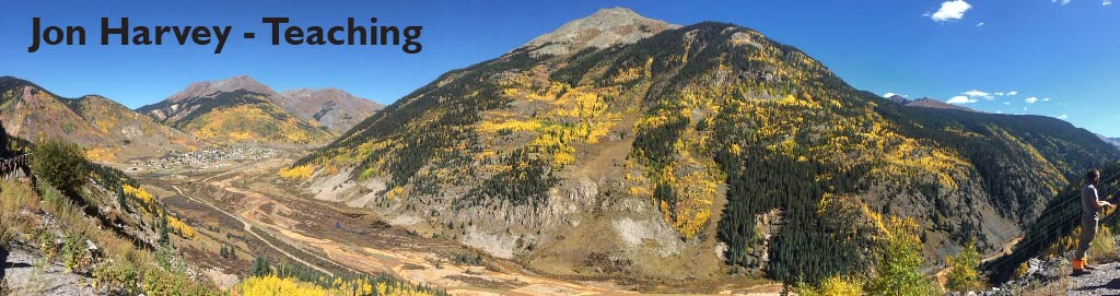 TeachingI teach a range of courses at Fort Lewis College, spanning Geology, Geography, and G.I.S.: Geology -GEOL105 - Earth and the Environment -GEOL323 - Geomorphology -GEOL475 - The Science of Climate Change -GEOL476 - Advanced Geomorphology -GEOL381 - Research Methods -GEOL496 - Senior Seminar -GEOL441 - Field Geologic Methods II (summer field camp) Geography -GEOG235 Weather and Climate G.I.S. -GEOG310 Introduction to Computer Mapping and GIS -GEOG315 GIS Programming and Web Mapping -GEOG350 Intermediate (vector) GIS -GEOG400 Advanced (raster) GIS